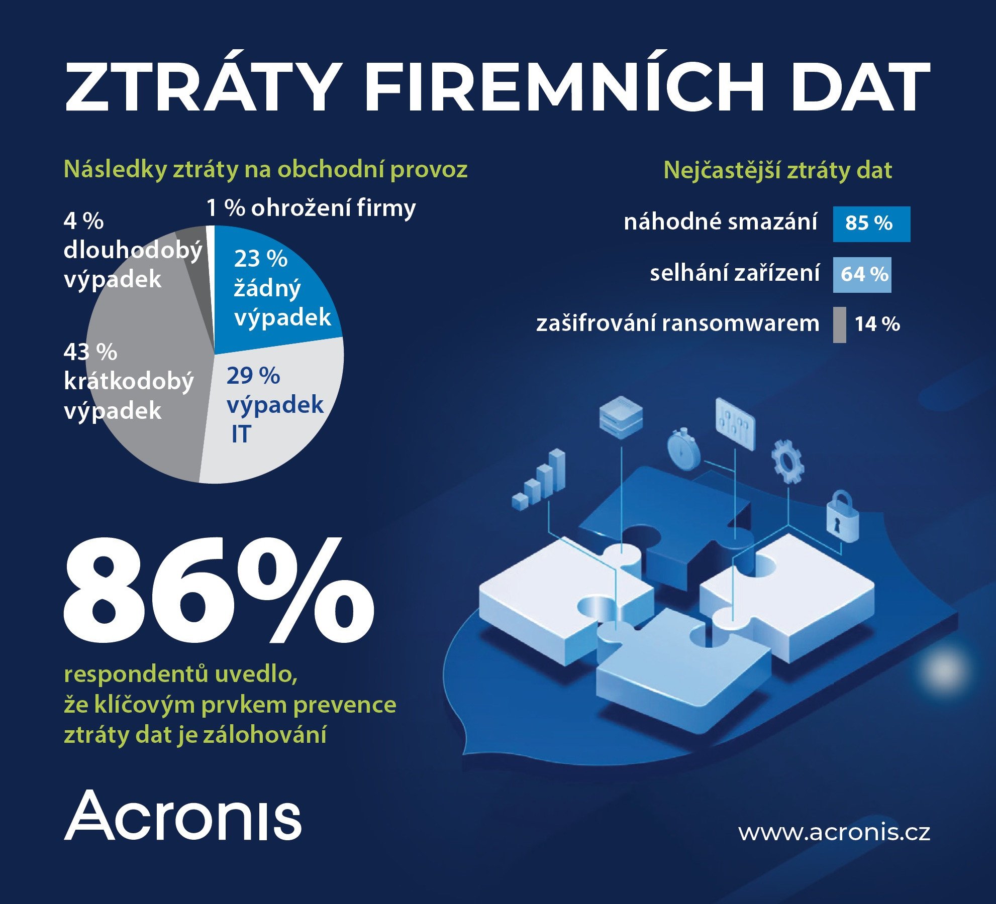 Podle lokálního průzkumu firmy Acronis již 43 % českých podniků zažilo několikahodinový výpadek obchodního provozu v důsledku ztráty firemních dat. Delší provozní výpadky, hraničící výjimečně až s ohrožením existence podniku, přiznalo pět procent respondentů. Za klíčový prvek prevence ztráty dat považuje 86 % respondentů zálohování.