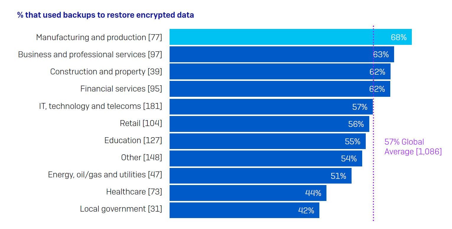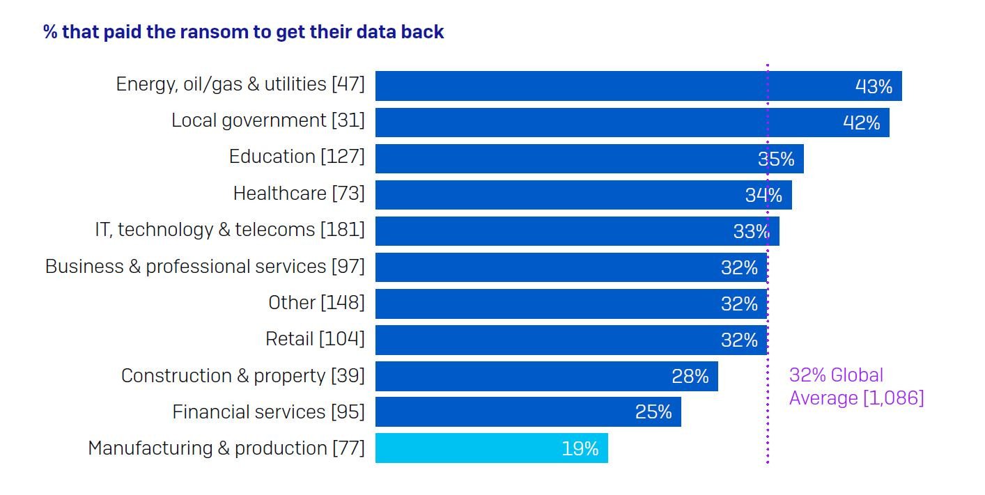 V roce 2020 zaplatilo útočníkům za dešifrování souborů pouze 19 % podniků ze sektoru výroby a produkce (průměr napříč všemi sektory je 32 %). V Evropě bylo ransomwarem zasaženo 41 % výrobních firem a jejich průměrná výše nákladů na obnovu byla 2,53 milionu amerických dolarů.