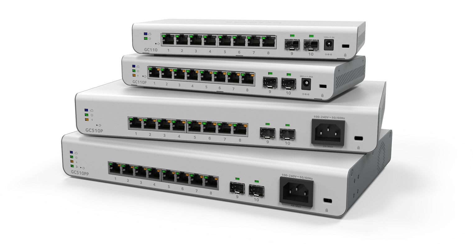 • GC510P – osmiportový gigabitový ethernetový PoE+ přepínač s PoE kapacitou až 134 W. Přepínač je k dispozici v bezvětrákovém provedení a lze jej umístit do racku.