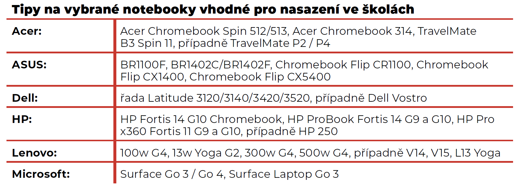 Na počítačích určených do škol se můžeme nejčastěji setkat se dvěma hlavními platformami: Microsoft Windows a Google Chrome OS. V případě Microsoftu jde o Windows 11, případně speciální edice Windows 11 Pro Education nebo Windows 11 SE, které se od standardního vydání liší zjednodušeným uživatelským prostředím a nástroji speciálně navrženými pro školy. Systém využívá cloudové pojetí a složky jako Plocha, Dokumenty či Fotky lze ukládat na online úložišti OneDrive, pomocí něhož jsou zálohované a dostupné i z dalších zařízení. Aplikace zde navíc mohou instalovat jenom správci IT a uživatelé nemají přístup k Microsoft Storu ani nemohou stahovat a instalovat aplikace z internetu. I podrobnější systémovou konfiguraci mohou ovlivnit pouze správci (či jiné zodpovědné osoby). Microsoft samozřejmě nabízí i celou řadu doplňkového softwaru včetně populární aplikace Teams pro vzdělání, Microsoft 365 Education a dalších… Díky různým pobídkám lze podporované přístroje u distributorů navíc často získat i za atraktivnějších finančních podmínek.