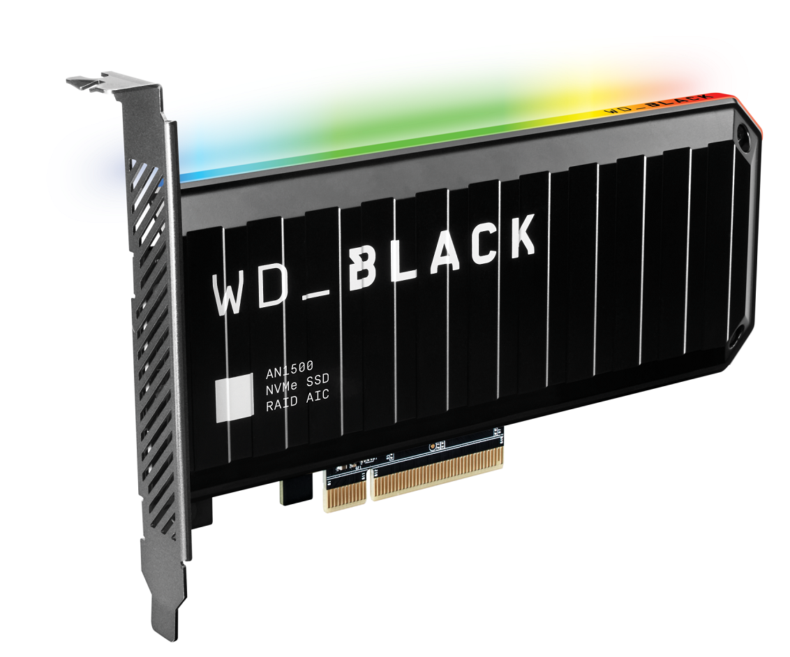 WD_BLACK AN1500 NVMe SSD Add-in-Card: Zařízení pro hráče, kteří chtějí dosahovat i u současné počítačové sestavy dosahovat výkonu srovnatelnými s novou generací úložišť a rozhraní. Tato plně bootovatelná, plug-and-play karta AIC je jedním z nejrychlejších řešení s technologií PCIe Gen3 x8 na trhu. Základem jsou dvě SSD v režimu RAID 0 a technologie PCIe Gen3 x8, což umožňuje dosáhnout na rychlosti načítání až 6 500 MB/s a rychlosti zápisu až 4 100 MB/s (platí pro 2TB a 4TB modely). Karta je doplněna nastavitelným RGB podsvícením (pouze Windows) pro zvýšení dojmu a výsledného efektu herní sestavy. Dále karta disponuje integrovaným chladičem, který vítězí nad zahříváním, snižuje teplotu a udržuje stabilní výkon.