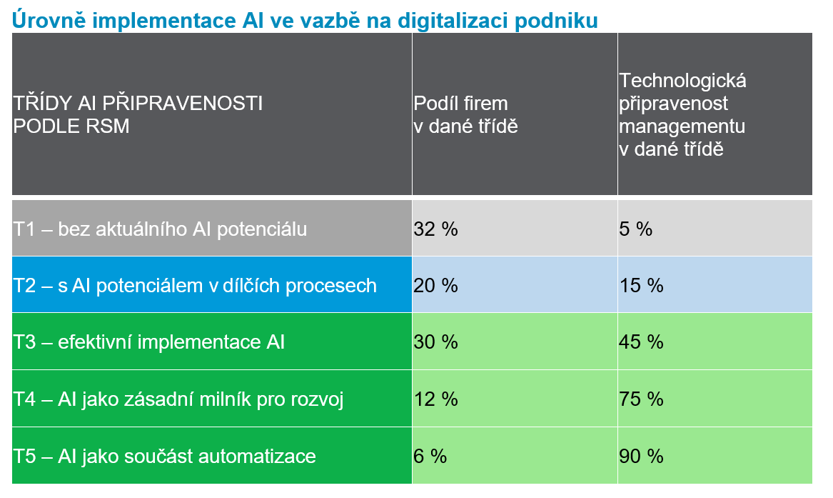 Potenciál tedy máme a know-how taky. S jasně nastavenými pravidly a legislativním rámcem tak zbývá poslední velká bariéra, a tou jsou firmy samotné. Jejich digitalizační procesy jsou velmi pozadu a bez řádné digitalizace je práce s AI skoro nemožná. Podle RSM se 52 % firem řadí do kategorie digitalizace 1 a 2, což znamená, že jsou buď zcela nedigitalizované, nebo digitalizováné pouze minimálně.