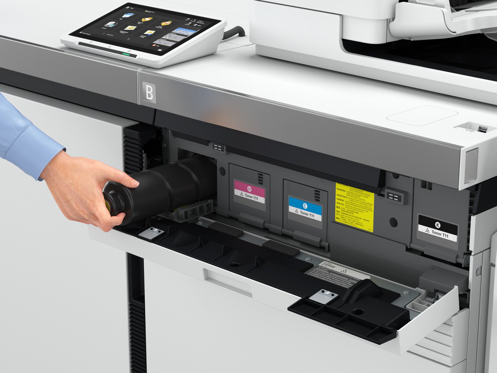 Díky nové dvoustupňové korekci registrace má tiskárna možnost automatického oboustranného tisku prodloužených archů až do délky 1,3 m. Neplánované odstávky a zpomalení jsou minulostí díky dálkovým hlášením, která obsluhu informují o nedostatku spotřebního materiálu. Kromě toho může obsluha měnit média, doplňovat toner a odstraňovat odpadní toner za chodu, čímž se zachovává jeho produktivita.