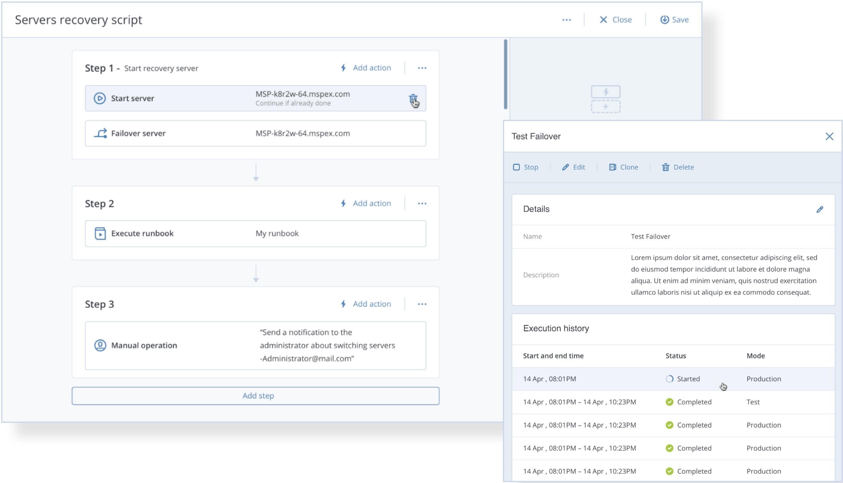- Orchestrace disaster recovery. Nová verze zjednodušuje a automatizuje komplexní plány pro obnovu po havárii s pomocí scénářů. Nová funkcionalita scénářů usnadňuje a urychluje obnovu více strojů z obnovovacího cloudového úložiště. Zajišťuje, že systémy jsou obnoveny ve správném pořadí, aby se uchovala vzájemná aplikační propojení na odlišných strojích.