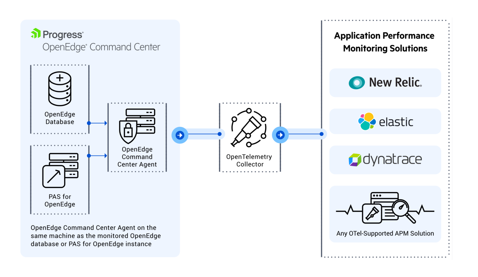 - OpenEdge Command Center (OECC): Moderní cloud-ready nástroj a API, které zjednodušují správu aplikací OpenEdge. OECC poskytuje centralizované monitorování, administraci a diagnostiku a integruje oblíbené nástroje pro správu výkonu aplikací (APM).