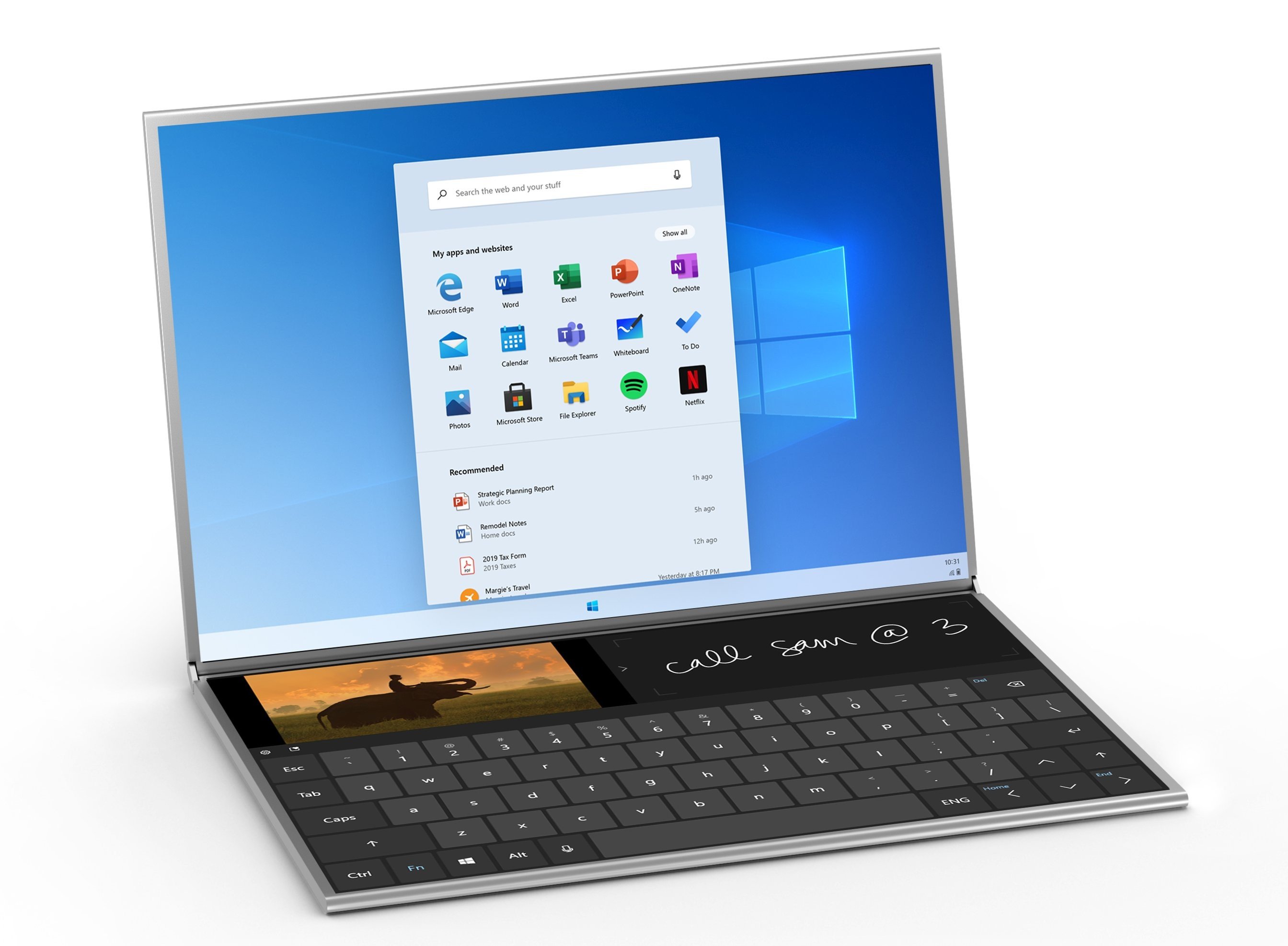 Microsoft Neo je ta větší z obou dvoudisplejových novinek – zákazníci se v tomto případě mohou těšit na dvojici 9" obrazovek, které by společně po rozevření měly poskytnout pracovní plochu běžnou pro dnešní 13" zařízení. Díky 360o půjde oba displeje podle potřeby rozevřít nejenom do roviny, ale i do řady dalších pozic, např. „stanu“. Zařízení poběží na upravených Windows 10 (Microsoft o nich hovoří jako o Windows X), která by měla být přizpůsobena pro nasazení na dvou displejích. Pro Surface Neo bude rovněž k dispozici volitelná klávesnice, která se bude přikládat na spodní displej, čímž vznikne pomyslný notebook. Zajímavé je, že zařízení bude reagovat na pozici klávesnice – pokud klávesnicí překryje horní část obrazovky, její zbývající spodní plocha poslouží jako tablet. Pokud naopak klávesnicí zakryjete spodní část obrazovky, v horní části displeje zbyde pracovní prostor pro aplikace či informace.