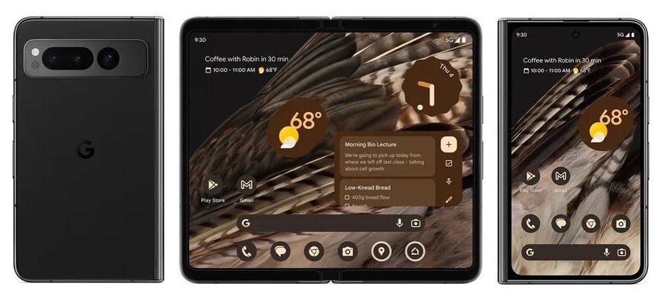 Vůbec největší pozornost pravděpodobně poutal první skládací telefon Googlu. Pixel Fold, jak se novinka nazývá, využívá stejně jako dřívější Pixel 7 Pro čip Tensor G2, v tomto případě doplněný o 12 GB LPDDR5 RAM a 256GB nebo 512GB UFS 3.1 úložiště. Výhodou telefonu je možnost jej rozevřít a získat tak dotykový OLED panel s úhlopříčkou 7,6", rozlišením 2 208 × 1 840 a jasem ve špičce až 1 450 nitů. V případě potřeby je k dispozici také vnější 5,8" OLED displej s rozlišením 2 092 × 1080 s maximálním jasem až 1 550 nitů (ve špičce). Frekvence obou displejů činí až 120 Hz.