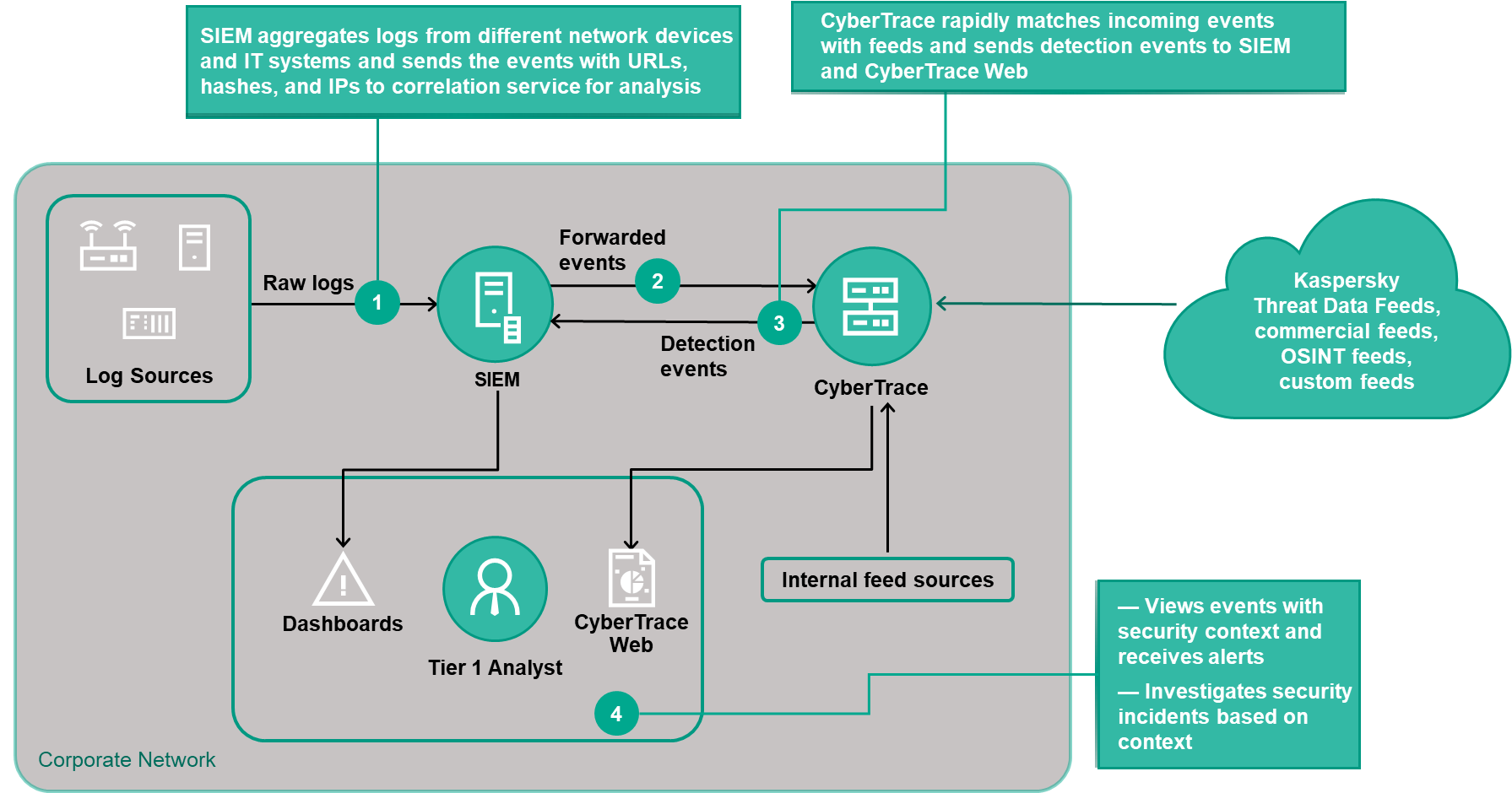 Aby firmy držely krok s nejnovějšími kybernetickými hrozbami a mohly jim úspěšně čelit, načítá Kaspersky CyberTrace průběžně aktualizovaná data o hrozbách z různých zdrojů. Slučuje tak informace od Kaspersky Lab, jiných poskytovatelů bezpečnostních služeb, z open source i firemních zdrojů. Tato data automaticky a ve velmi krátkém časovém rozmezí srovnává s probíhajícími bezpečnostními událostmi, čímž ulehčuje přehlceným technologiím SIEM.