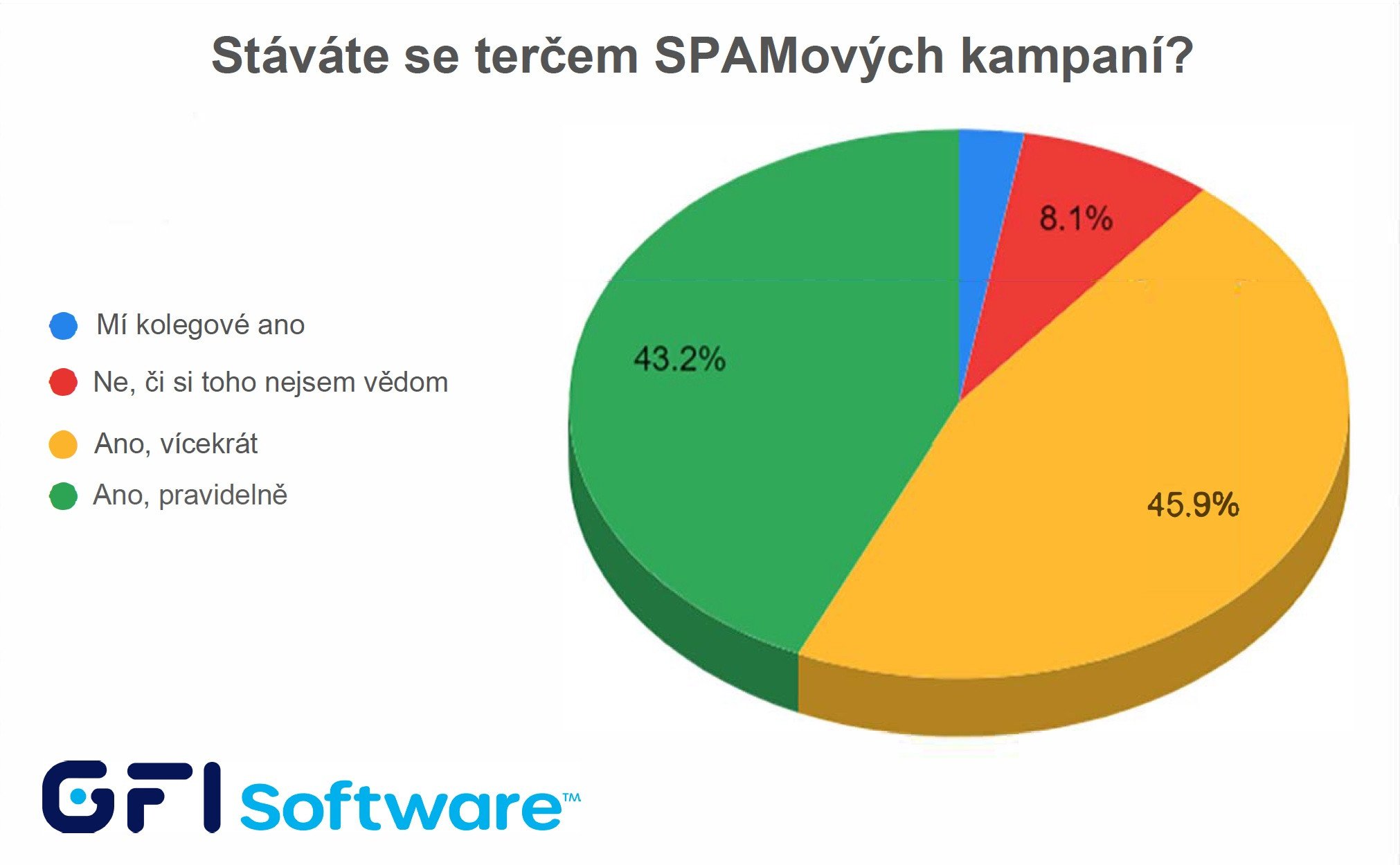 - 89 % globálních zákazníků GFI Software je terčem spamových kampaní vícekrát či pravidelně, v případě českých a slovenských zákazníků je to 67 %.