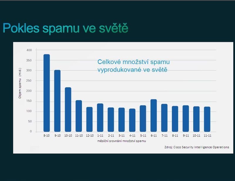 V roce 2011 podle Cisca pokračoval trend poklesu spamu, který byl poprvé zaznamenán v roce 2010. Celosvětově tak množství spamu kleslo z 379 miliard zpráv v srpnu 2010 na 124 miliard zpráv v listopadu 2011. V České republice pokles množství spamu činil 88 procent.