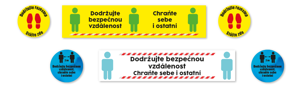 Sada bezplatných médií obsahuje kulaté podlahové samolepky o rozměrech 285 x 285 mm a obdélníkové samolepicí bannery o rozměrech 215 x 900 mm a 297 x 1320 mm. Grafické podklady srozumitelně sdělují, že je třeba udržovat minimální dvoumetrovou vzdálenost.