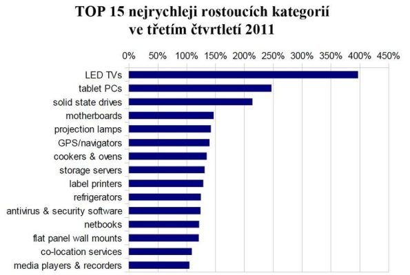 Tablet PC (+247 procent) díky svému zrychlení z minula tentokrát už překonávají netbooky (+121 procent), ale stále nepředstavují výzvu pro notebooky (+65 procent) nebo PC (+74 procent). Stálý nárůst bílé techniky, jako jsou sporáky a trouby (+135 procent) a chladničky (+124 procent), ukazuje na dlouhodobý posun – prodejci domácích elektrospotřebičů se neodvratně posunují do e-tailu.