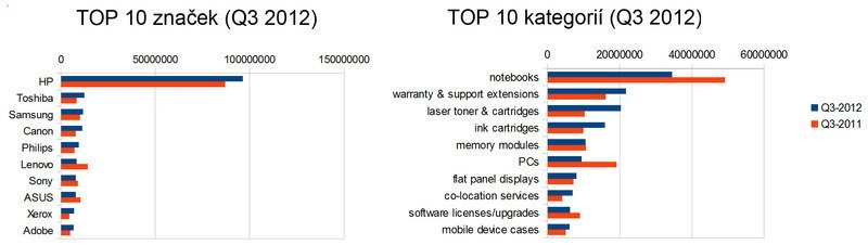 Intel je nejznámější značkou v Top 10 rychle rostoucích značek v prodejním kanálu ve 3. čtvrtletí 2012 – povedlo se mu vylepšit objem stažených produktových listů meziročně o 328 %. Dodavatel kabelů a mobilních prvků Oncore je v Top 10 již ve druhém čtvrtletí po sobě. Dodavatel počítačového příslušenství BTI je ve 3. kvartálu nejrychleji rostoucím šampionem (+559 %). Rovněž další výrobci příslušenství jako Ergotron, Newstar a CablesToGo dosahují nadprůměrných výsledků. Zajímavé je zastoupení Braunu – značky, která licencovala své jméno na výrobky z mnoha kategorií spotřební elektroniky od fotorámečků přes displeje až po své známé holicí strojky.