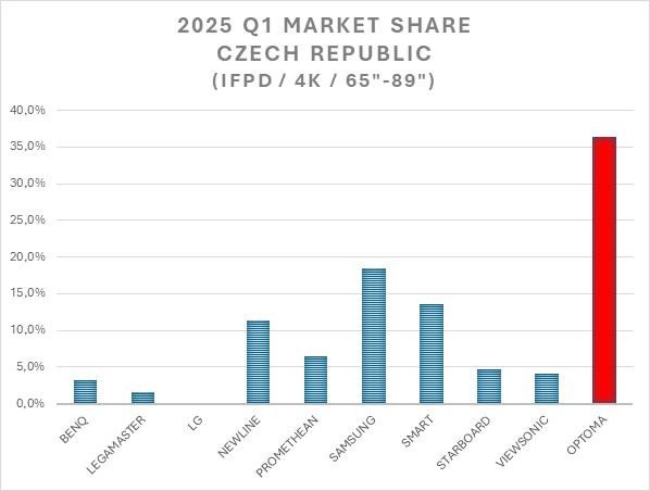 Společnost Optoma se v 1. čtvrtletí roku 2025 stala s 36,4% podílem nejprodávanější značkou interaktivních displejů v České republice.