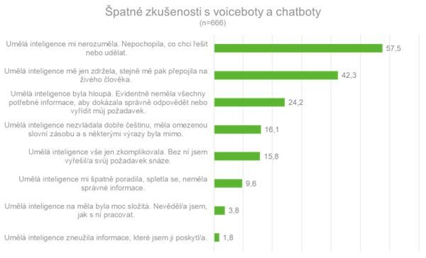 Potvrzují to i další výsledky průzkumu, podle kterých souvisejí špatné zkušenosti zákazníků především s nedostatečnou úrovní a rozsahem úkonů, které chatbot či voicebot zvládne vyřešit. Vůbec nejčastější špatná zkušenost spočívá v tom, že umělá inteligence lidem nerozuměla a vůbec nepochopila, co chce člověk řešit nebo udělat. Druhým nejčastějším problémem je fakt, že umělá inteligence lidi ve skutečnosti jen zdržela a stejně pak musela předat požadavek živému operátorovi.