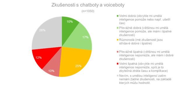 S komunikací s chatboty, voiceboty či virtuálními asistenty má osobní zkušenost již 74 % Čechů ve věku od 18 do 65 let. Jejich dojmy jsou sice spíše pozitivní, ale také velmi různorodé, což je dáno velkými rozdíly v kvalitě zpracování těchto nástrojů umělé inteligence. Špatné zkušenosti souvisejí především s nedostatečnou úrovní chatbotů či voicebotů.