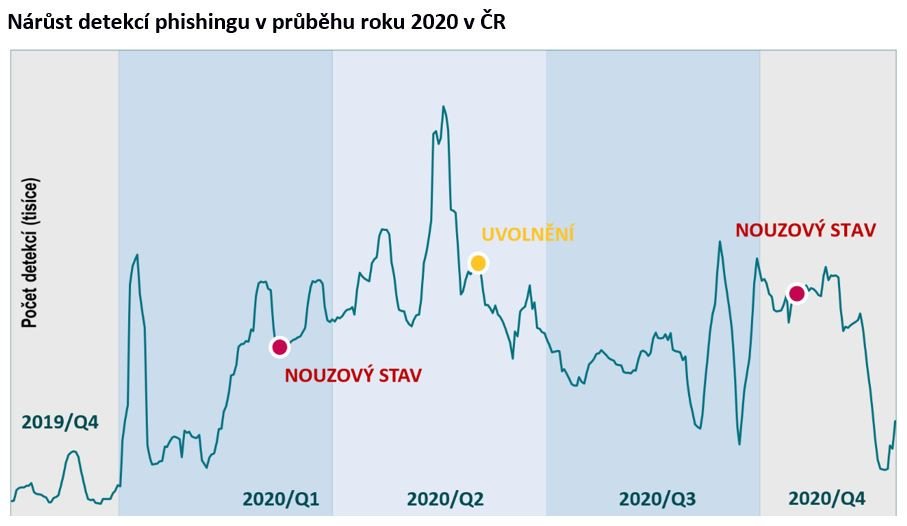 Nejvýraznějším rizikem v Česku zůstávají hrozby šířící se e-maily, zejména spam a phishing, což je typ útoku, který se snaží vylákat z oběti osobní údaje nebo hesla. Počet detekcí phishingu narostl v porovnání s rokem 2019 o přibližně 100 %.