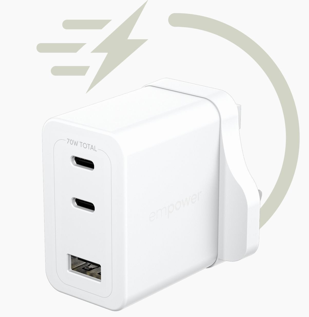 Všechny nabíječky mají reálnou kontrolu teploty, která je až o 10 °C níže, než jsou mezinárodní standardy. Nechybí zde ochrana proti přehřátí, což nabíječce prodlužuje životnost. V případě nabíječek s více porty se výkon inteligentně rozděluje mezi jednotlivá zařízení a například se 70W variantou není problém nabíjet souběžně MacBook Air a iPhone. V kombinaci s kabely empower tak jde o bezkompromisní řešení pro nabíjení různých typů zařízení od různých výrobců. Také nabíječky jsou vyráběny s ohledem na planetu. Vyráběny jsou ze 75 % z lastu z post‑consumer recyklace (PCR).