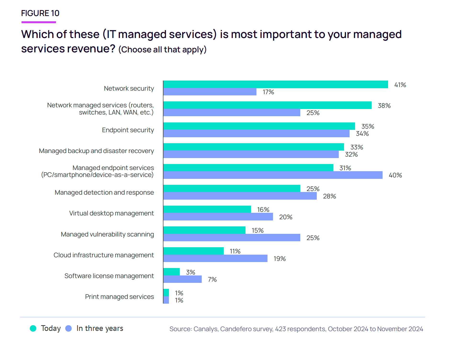 - Služby související s kybernetickou bezpečností představují čtyři nejvýznamnější segmenty, které se budou podílet na příjmech z řízených služeb v příštích třech letech, přičemž na prvním místě seznamu je správa koncových zařízení.