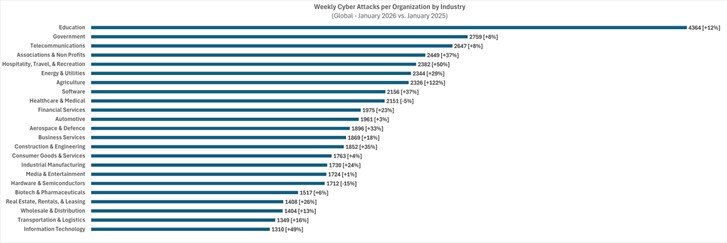 Největší hrozbě čelí s obrovským náskokem sektor vzdělávání, jde dokonce v průměru o 4 364 útoků týdně na jednu organizaci. Pro kyberzločince je atraktivní kombinace vysokého počtu uživatelů, zastaralé infrastruktury a omezených zdrojů na ochranu. Druhým nejčastěji napadaným odvětvím je veřejná správa (2 759 útoků týdně v průměru na jednu instituci). Na třetí místo se posunuly telekomunikační společnosti. Vůbec největší meziroční nárůst útoků ( o 122 %) byl opakovaně detekován u zemědělství.