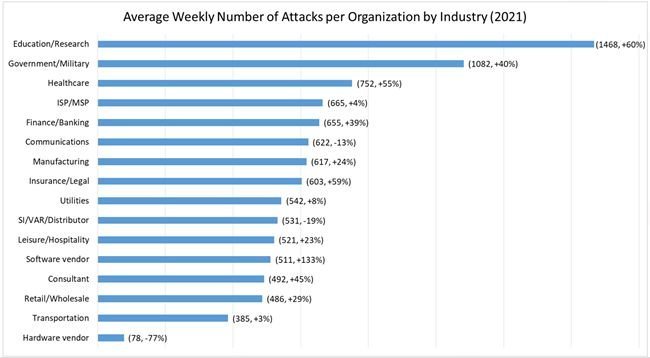 - Vzdělávací a výzkumné organizace jsou celosvětově nejvíce zasaženým sektorem. V průměru čelí každá vzdělávací nebo výzkumná organizace 1 468 útokům za týden, což je 60% nárůst oproti roku 2020.