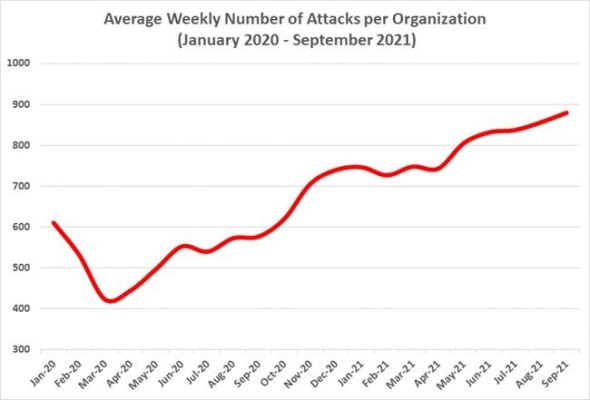 V září 2020 bylo maximem v průměru 523 útoků na jednu českou organizaci za týden, v září 2021 bylo týdenní maximum už 1 057 útoků, což je více než dvojnásobný nárůst během jediného roku. Počet útoků na české organizace se dlouhodobě drží nad celosvětovým průměrem.