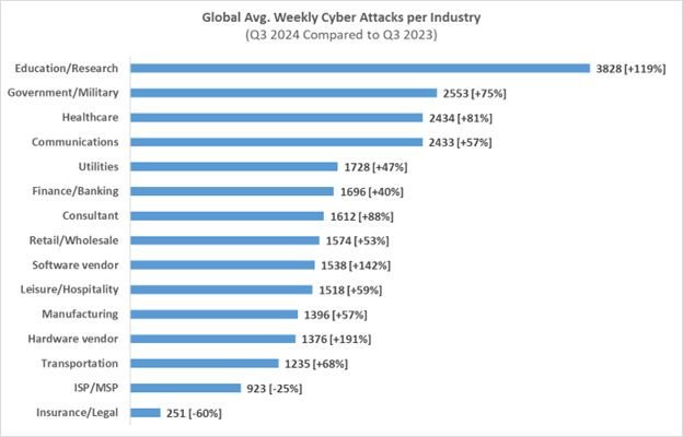 Nejčastějším cílem útoků jsou vzdělávací a výzkumné instituce, v průměru se jedná o 3 828 útoků týdně na jednu společnost, což je meziroční nárůst o 119 %. Druhým nejčastěji napadaným odvětvím je vládní a vojenský sektor (2 553 útoků týdně na jednu společnost), zdravotnictví na třetí příčce čelí v průměru 2 434 kyberútokům týdně na jednu organizaci. Druhý kvartál za sebou zaznamenali největší meziroční nárůst útoků (o alarmujících 191 %) dodavatelé hardwaru.