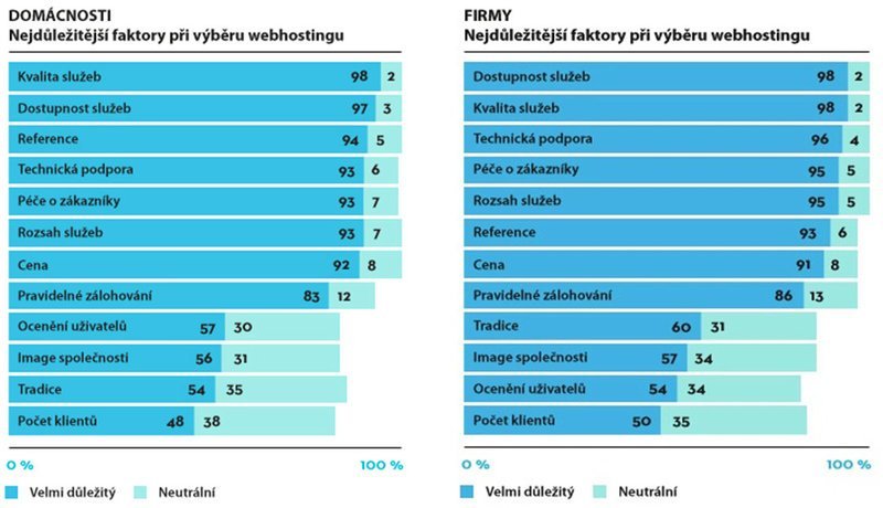 Ani jedna skupina dotazovaných překvapivě neumístila faktor ceny ani mezi pět nejdůležitějších kritérií. To můžeme přisuzovat rostoucí gramotnosti českých uživatelů, pro které není cena prioritním faktorem, protože vědí, že zdánlivě nízká cena může skrývat mnohá rizika. Dalším důvodem muže být fakt, že webhostingové služby nejsou v dnešní době drahé. Měsíční úspora v řádu desítek korun je zanedbatelná v porovnání s případnými náklady spojenými s nedostupností internetových stránek či s obnovou ztracených dat. Na kvalitě se v tomto případě rozhodně nevyplatí šetřit.