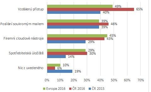 Využívání firemního cloudu letos oproti roku 2015 vzrostlo z 29 % na 43 % a Česko se tak z loňských spodních příček dostalo na evropský průměr (45 %). Téměř polovina (46 %) zaměstnanců si ale stále ještě posílá pracovní soubory na soukromý e-mail, což je o sedm procentních bodů více než loni. Využívání spotřebitelských úložišť se zdvojnásobilo (ze 14 % na 30 %). Soukromé maily ani běžná úložiště přitom nemohou zajistit potřebnou míru ochrany citlivých obchodních informací.