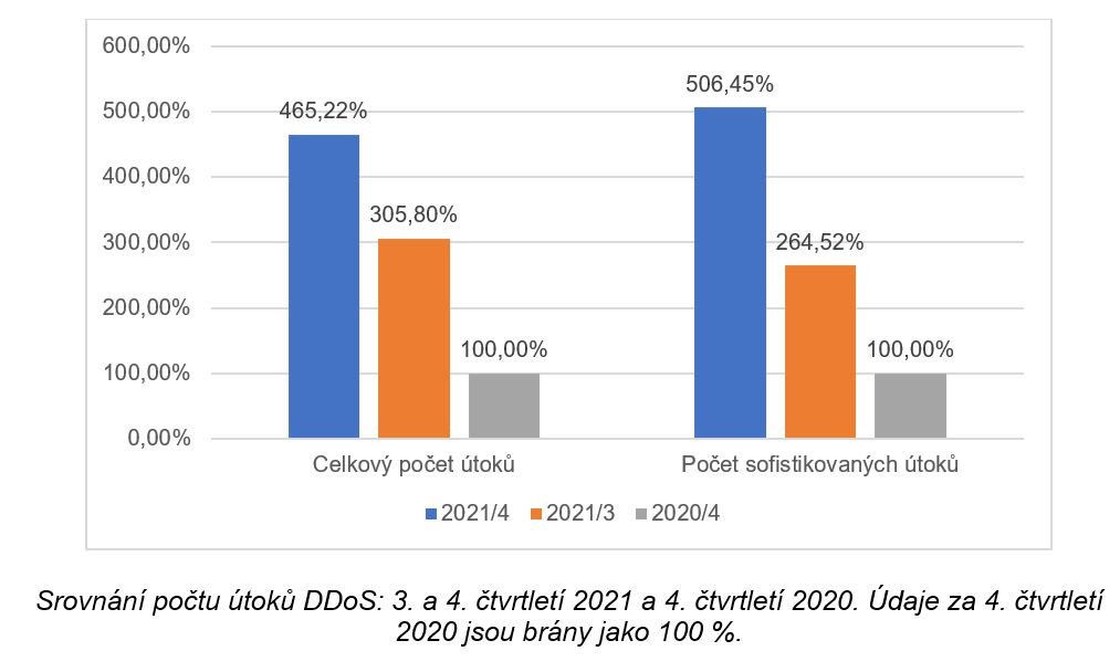 Během čtvrtého čtvrtletí 2021 byl zaznamenán extrémní nárůst počtu DDoS útoků, který nemá za dobu jejich monitorování obdoby. Ve srovnání s třetím loňským čtvrtletím narostl celkový počet zachycených DDoS útoků o 52 %. To je asi 4,5krát víc než ve stejném období loňského roku.
