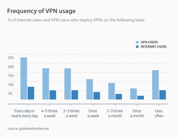 Dle údajů společnosti vpnMentor nejčastěji využívají připojení k internetu prostřednictvím VPN v Thajsku, Indonésii, Číně, Brazílii, Saudské Arábii, Turecku, Indii, Mexiku, Malajsii a Spojených arabských emirátech. Oproti tomu např. v Německu, USA, Velké Británii nebo Austrálii je obliba VPN podstatně nižší, za čímž samozřejmě stojí podstatně liberálnější přístup k internetu a dostupnosti služeb.