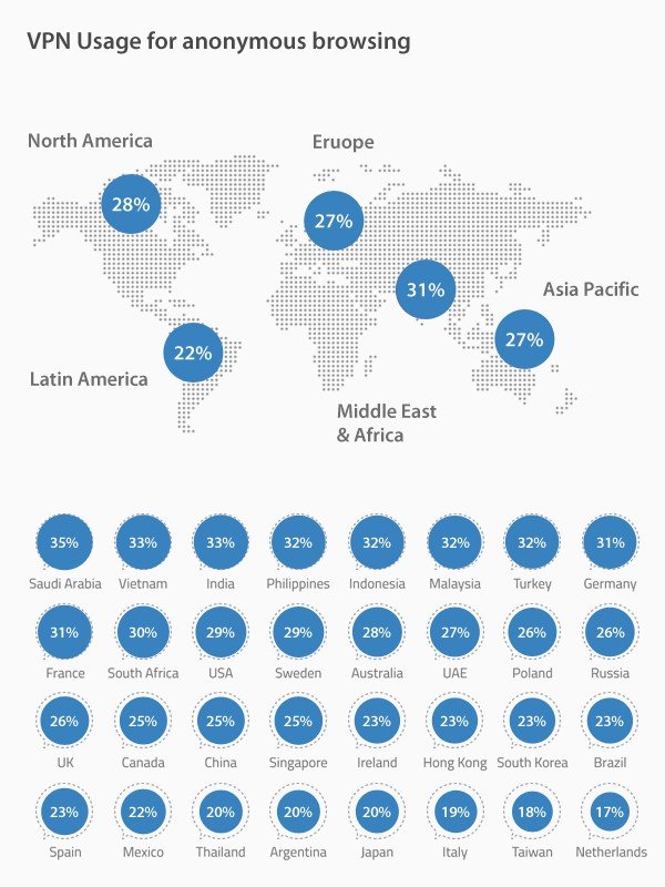 Anonymní prohlížení je hlavním důvodem pro použití VPN zejména v Saúdské Arábii, Indii a Vietnamu.