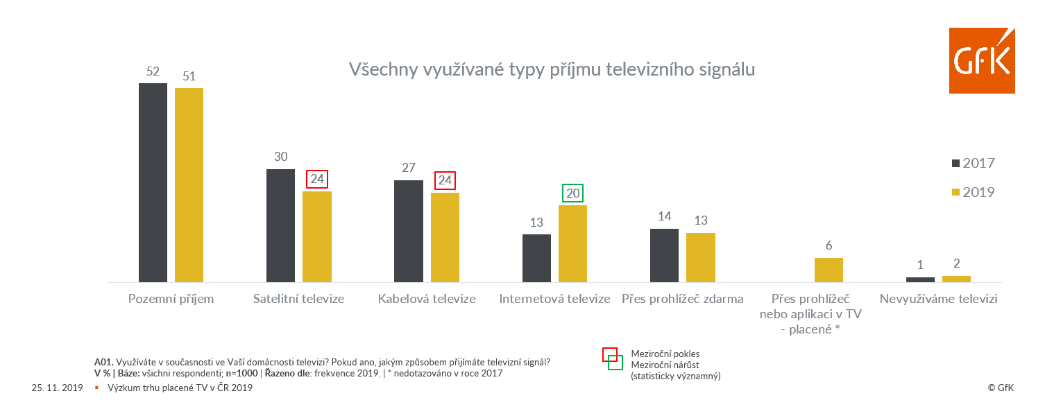 Na trhu placené televize zažívá úspěšné tažení televize přes internet (IPTV / OTT). V roce 2017 tento typ příjmu televizního signálu využívalo 13 % internetové populace, letos je to již 20 %. Internetová televize však neumenšila podíl uživatelů terestrického vysílání; nárůst mají na svědomí zákazníci opouštějící satelitní a v menší míře také kabelový typ příjmu placené televize.