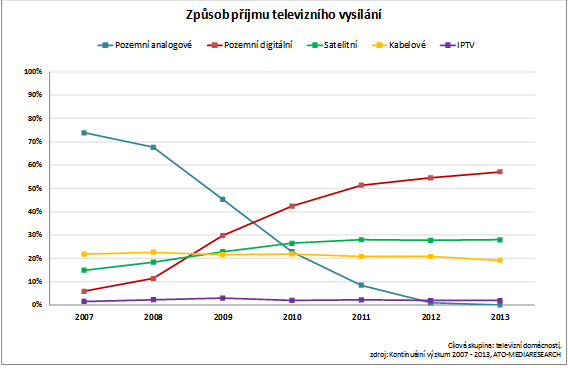 Z grafu je zároveň vidět, že samotného procesu digitalizace (který přivedl spoustu lidí k rozhodování, jakým způsobem budou dále televizní stanice přijímat) úspěšně využili satelitní operátoři, čemuž pomohli také svojí marketingovou aktivitou a zatraktivňováním svých nabídek. Procento domácností využívajících satelitní vysílání se v procesu digitalizace téměř zdvojnásobila na necelých 30 %, kde se pohybuje dodnes.