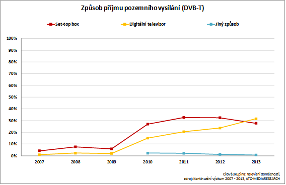 Co zásadního se dělo v průběhu procesu přechodu na pozemní digitální vysílání (DVB-T) z pohledu vybavení domácností televizní technikou a způsobu příjmu televizního vysílání v České republice zjistila společnost Mediaresearch. Údaje mohou napovědět, jaké změny se mohou projevit při přechodu na DVB-T2.