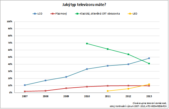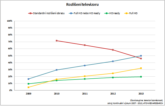 Postupné nahrazování starších televizorů přístroji novými se promítlo také do růstu procenta domácností vlastnících televizory s plochými obrazovkami a televizory, které jsou schopné přijímat obraz v HD rozlišení. Můžeme sledovat také růst procenta domácností, které mají televizory s poměrem stran 16 : 9.