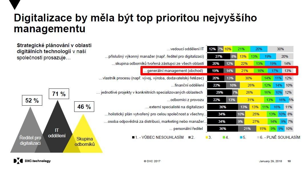 Při zkoumání, kdo je hlavním motorem digitalizace, průzkum ukázal, že v 71 % společností jde o IT manažery. Nejvyššímu vedení přisoudil vůdčí pozici v oblasti digitalizace každý druhý dotázaný (46 %) a shodný počet respondentů uvedl, že jde o záležitost odborných skupin, do kterých patří zástupci všech oborů. Provozní oddělení za hnací sílu v oblasti digitální transformace považuje pouze každý třetí dotázaný.