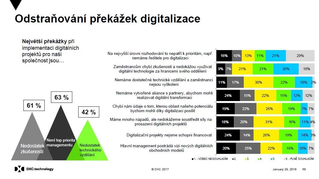 V odpovědích na otázku ohledně bariér digitálních projektů se odráží poměrně slabá podpora ze strany nejvyššího vedení. Každý druhý účastník průzkumu je přesvědčený o tom, že nejvyšší vedení nevěnuje digitální transformaci náležitou pozornost. Nedostatečné zkušenosti zaměstnanců se zaváděním digitálních technologií mimo jejich primární oddělení považuje za příčinu zpomalování při zavádění potřebných procesů 42 % respondentů. Mezery v technickém vzdělávání a další odborné přípravě považuje za důležitou překážku digitální transformace 20 % dotázaných.