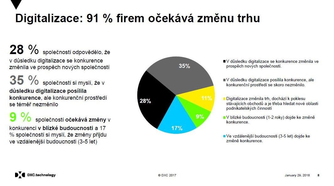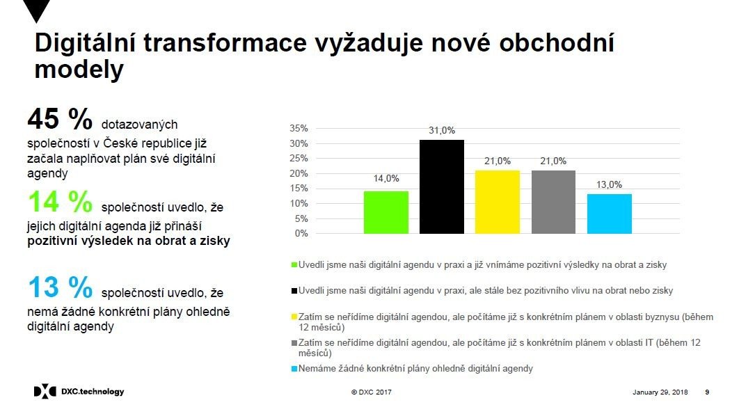 Téměř polovina společností se podle průzkumu společnosti DXC Technology zatím neřídí žádnou strategií pro digitální transformaci. A firmy, které o plánech pro digitální věk uvažují nebo již konkrétní kroky uskutečnily, mají i nadále řadu otázek. Podle účastníků průzkumu jde zejména o bezpečnost (82 %), digitální automatizaci (68 %) a sběr dat (63 %).