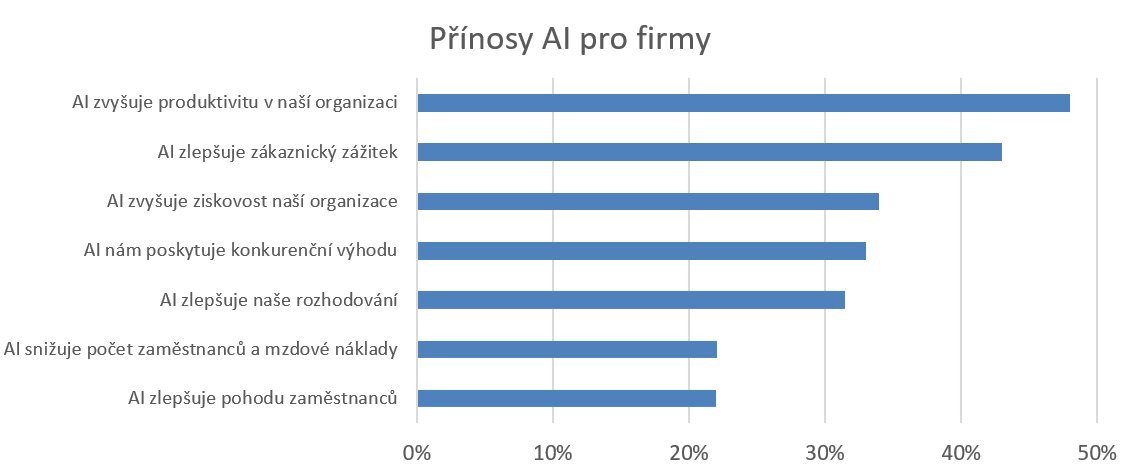 Za hlavní přínos využití umělé inteligence označilo 48 % respondentů zvýšení produktivity. Z odvětvového hlediska má sektor energetiky největší podíl respondentů, kteří uvádějí potenciální zvýšení produktivity díky investicím do AI, a to o 57 %.