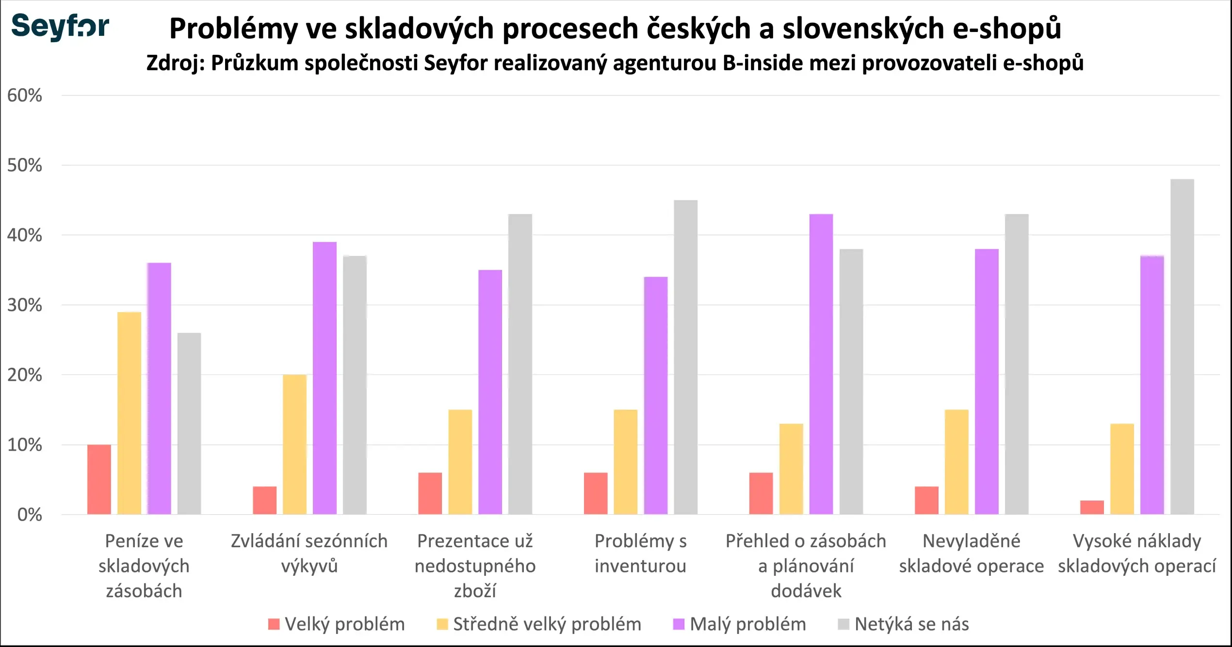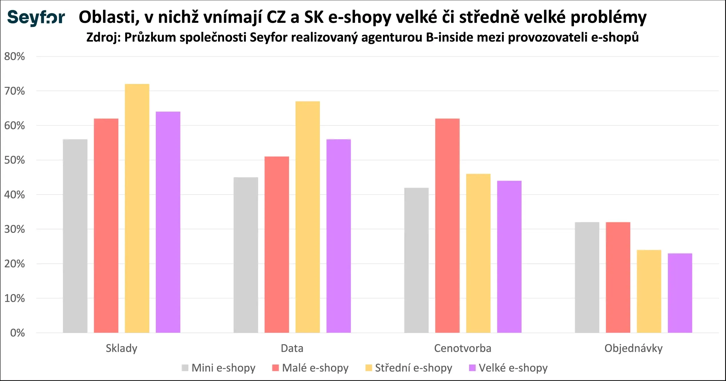 Průzkum, který vloni pro Seyfor provedla mezi českými a slovenskými provozovateli e-shopů agentura B-inside, ukázal, že zásadní problémy e-shopů se koncentrují do několika klíčových oblastí. Nejčastěji jde o skladové procesy, které jako problematické označilo 62 % e-shopů. Následuje práce s daty (53 %) a cenotvorba (46 %). Výrazně méně často e-shopaři uvádějí problémy se zpracováním objednávek, které řeší pouze 28 % respondentů.