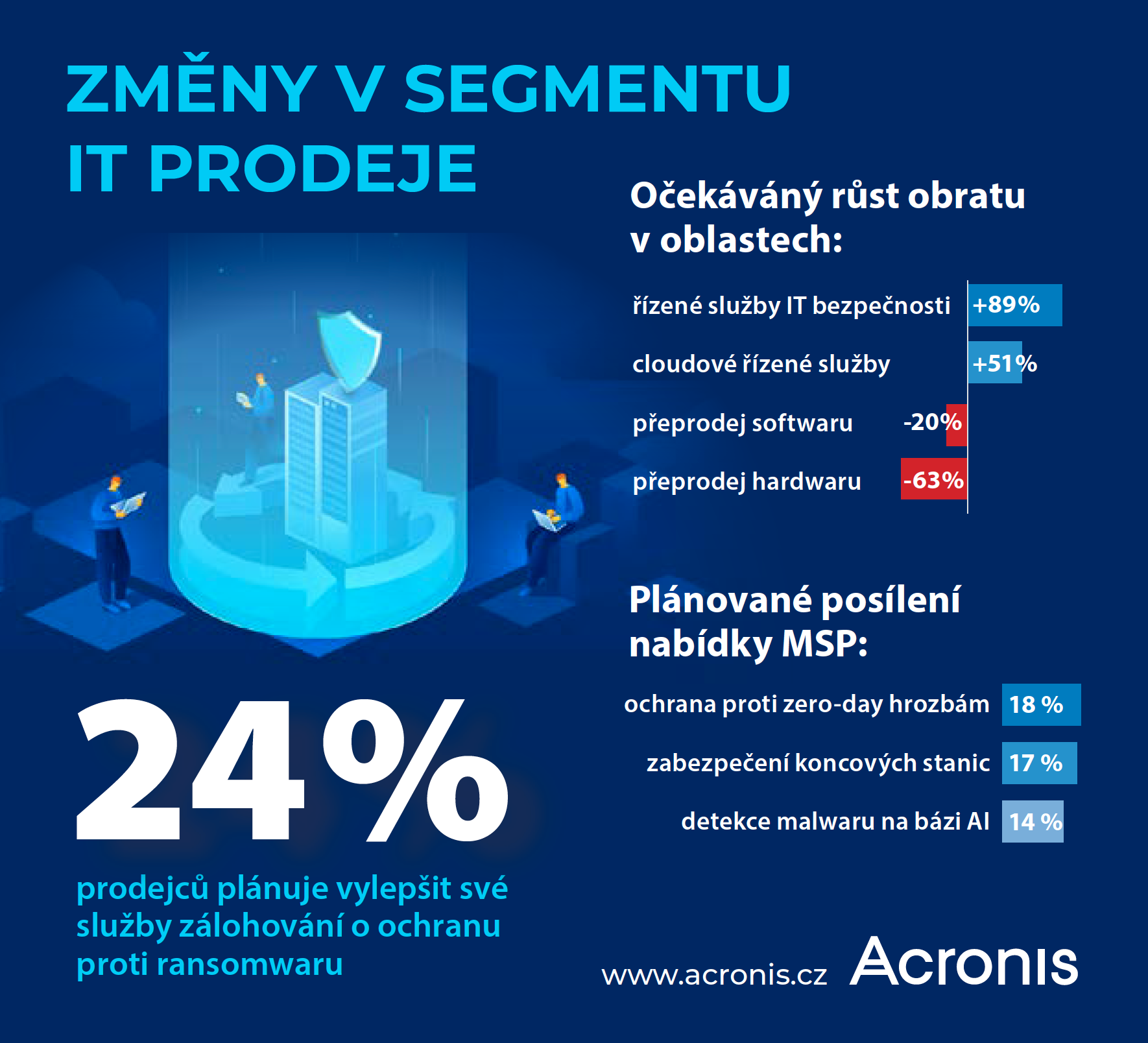 - MSP očekávají, že v příštích dvou letech vzroste jejich obrat v segmentu řízených služeb IT bezpečnosti v průměru o 89 %, cloudových řízených služeb o 51 %, přičemž poklesne obrat z přeprodeje softwaru o 20 % a hardwaru o 63 %.