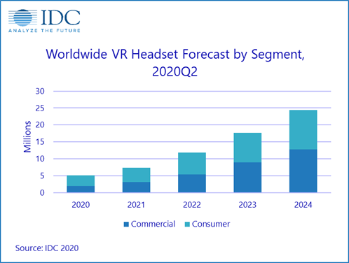 Ačkoli IDC počítá s tím, že letos se kvůli okolnostem spojeným s pandemií viru COVID-19 dočká trh s headsety pro virtuální realitu propadu (asi o sedm procent), již v příštím roce by měl opět takřka o polovinu (asi 42 % růst).