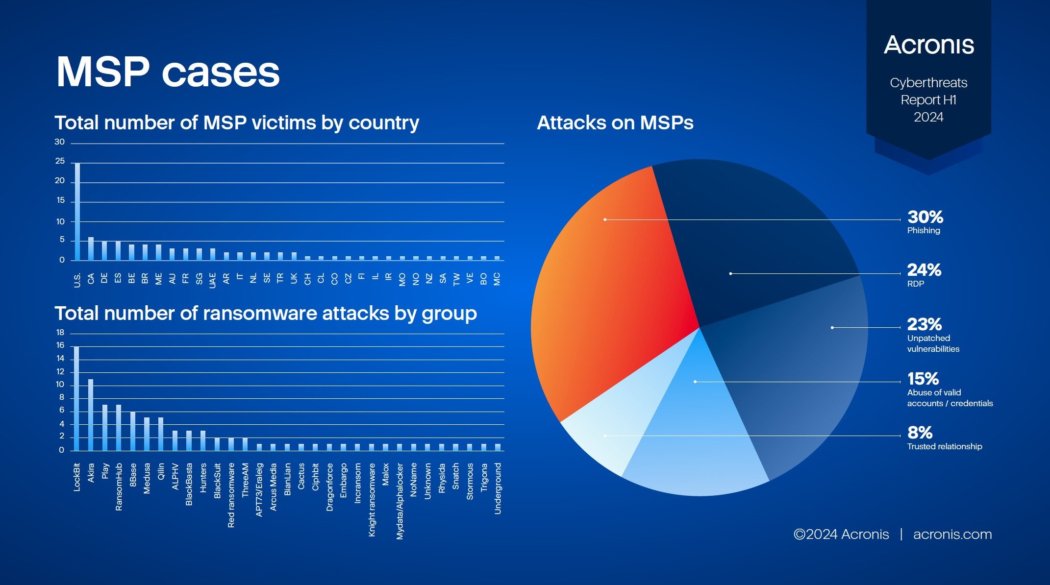 Zpráva Acronis Cyberthreats Report H1 2024 zjistila, že e-mailové útoky zaznamenaly 293% nárůst ve srovnání se stejným obdobím roku 2023. Rostl také počet detekovaných ransomwarových útoků, který od 4. čtvrtletí 2023 do 1. čtvrtletí 2024 narost o 32 %.