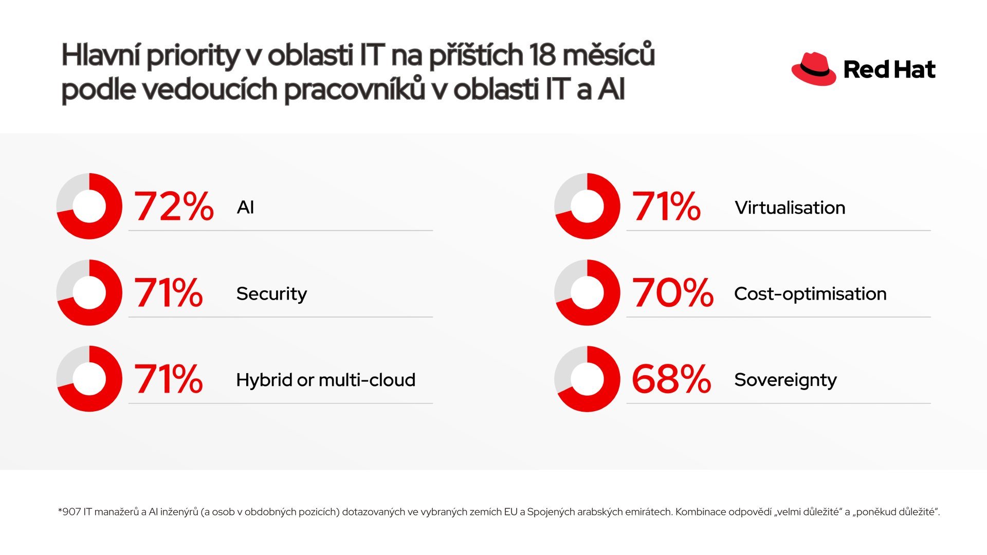Údaje pocházejí z nejnovějšího průzkumu společnosti Red Hat mezi více než 900 IT lídry a AI inženýry v devíti evropských zemích.