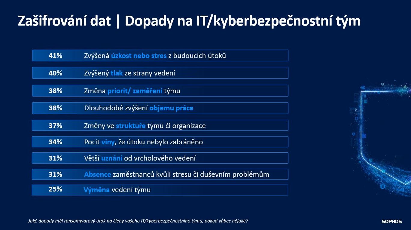 Všechny společnosti, jejichž data byla během ransomwarového útoku zašifrována, uvedly, že jejich pracovníci z oddělení IT a kybernetické bezpečnosti zaznamenali i osobnostní negativní důsledky. Kromě problémů spojených s obnovou systémů čelili také emocionální zátěži. Až 41 % respondentů uvedlo, že se u nich zvýšil stres a obavy z budoucích útoků. Každý třetí měl pocit viny za to, že se mu nepodařilo incidentu včas zabránit.