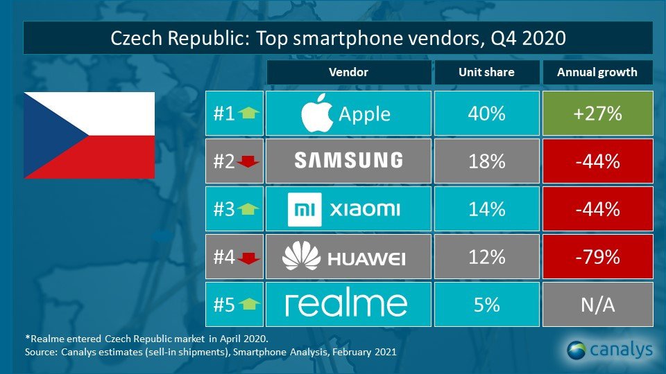 Mobilní telefony Realme pronikly mezi pětici nejprodávanějších značek na českém trhu. Informace vyplývá z dat společnosti Canalys za poslední čtvrtletí roku 2020.