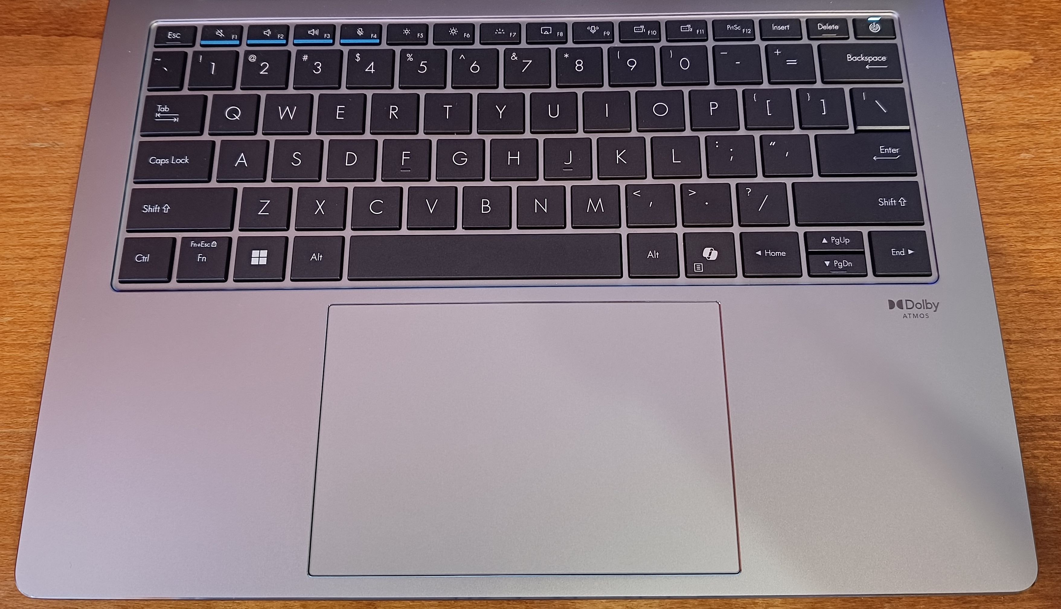 Pokud už se však rozevření víka (lze jej rozevřít až do úrovně 180 stupňů) povede, dostane se uživatel k pohodlné klávesnici s příjemným stiskem a odezvou a pro tohoto výrobce typickým rozložením. Podsvícení klávesnice lze regulovat v několika stupních (nebo automaticky) a její součástí je také tlačítko pro aktivaci Microsoft CoPilotu. Za zmínku stojí také odolnost klávesnice proti polití. Ergonomii pomáhá také pohodlný, rozměrný, jednolitý touchpad s podporou chytrých gest pro ovládání jasu, hlasitosti a přetáčení videa. Celkově jsem neměl s ovládáním počítače potíže a na klávesnici i touchpad jsem si zvykl rychle.