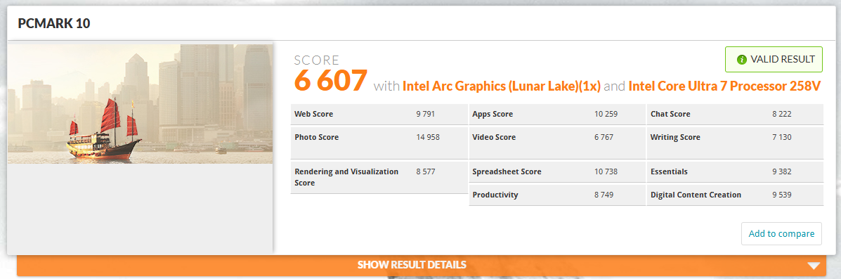 V našem počítači byl osazen čip Core Ultra 7 258V s osmi jádry (čtyřmi výkonnými a čtyřmi efektivními) a maximální frekvencí 4,8 GHz. Nominální DPT činí 17 W, krátkodobě si však čip může sáhnout až na 37 W. Součástí čipu je také integrovaná 32GB paměť LPDDR5X s frekvencí 8 533 MT/s.