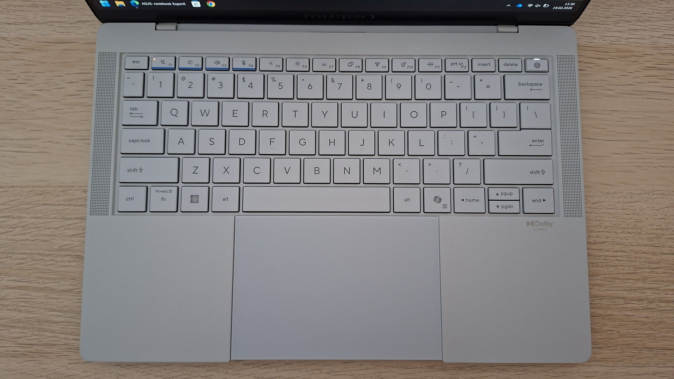 Výraznou část prostoru pod klávesnicí zabírá rozměrný touchpad. Je pohodlný, snadno se mačká po celé své ploše, a kromě běžných funkcí nabízí chytrá gesta pro rychlé nastavení jasu obrazovky nebo hlasitosti zvuku. Novinkou je praktická vibrační (haptická) odezva, která uživatele doprovází při některých činnostech (například při použití výše zmíněných gest).